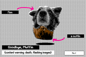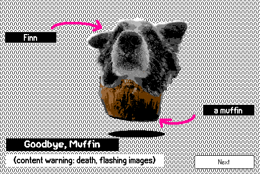 You should see the game embedded on this very page and you can interact with it immediately. If you're not able to play it, you can download the "Goodbye, Muffin.deck" file and run it on Decker on your computer.