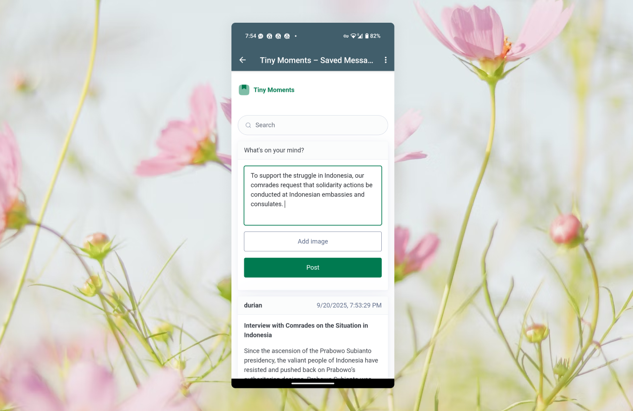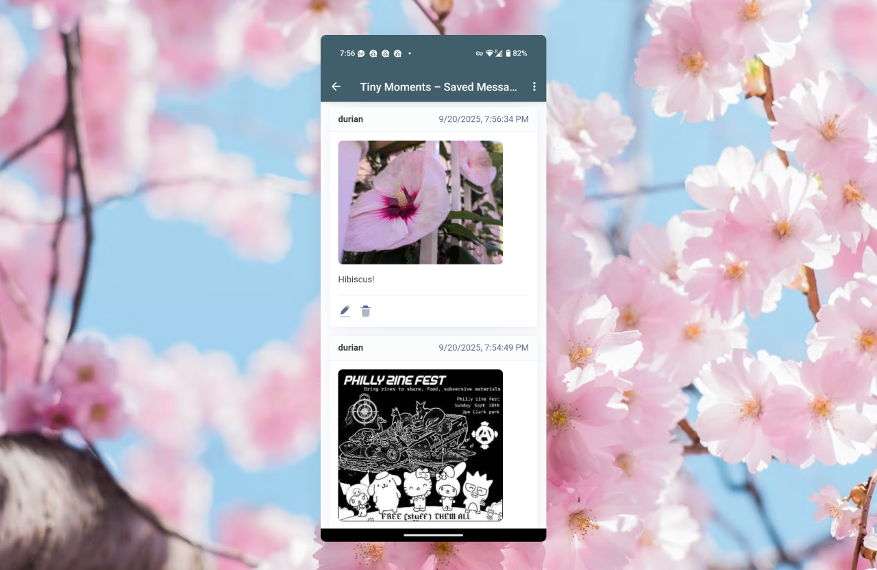 Tiny Moments is a free, minimalist journal / microblogging app that you can use for yourself or with your close friends. It's tiny enough that 13 of these would fit inside a floppy disk! It's meant to run on the Delta Chat messenger which is available for iOS, Android, Windows, macOS, Linux, and even Ubuntu Touch. You can also use it on monocles chat and Cheogram as well! You can use it for: